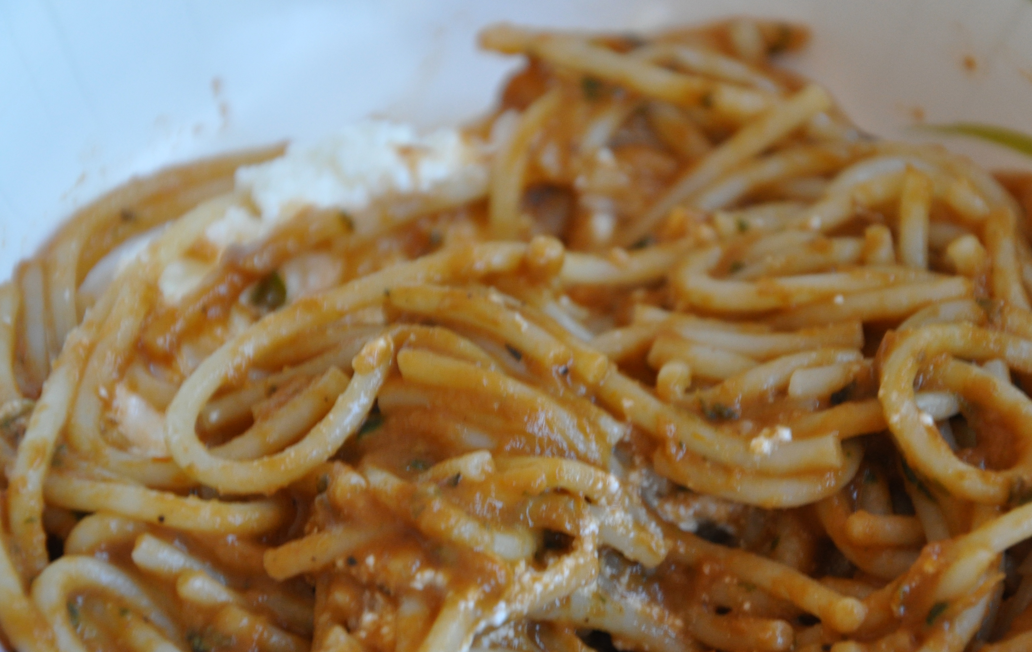 I fried 1 onion and 1 eggplant about 6-7 minutes until very tender. Then I added a yellow pepper for a few minutes until tender. I added garlic for about 30 seconds before I added a can of Muir Glen diced tomato. Add red pepper flakes, pepper, salt, and oregano to taste. Mix in your cooked pasta (I used Barilla Plus) and top with cold ricotta, parmesan, and fresh basil. My favorite is Stoneyfield Farm’s organic ricotta. A quick meal in under 30 minutes.