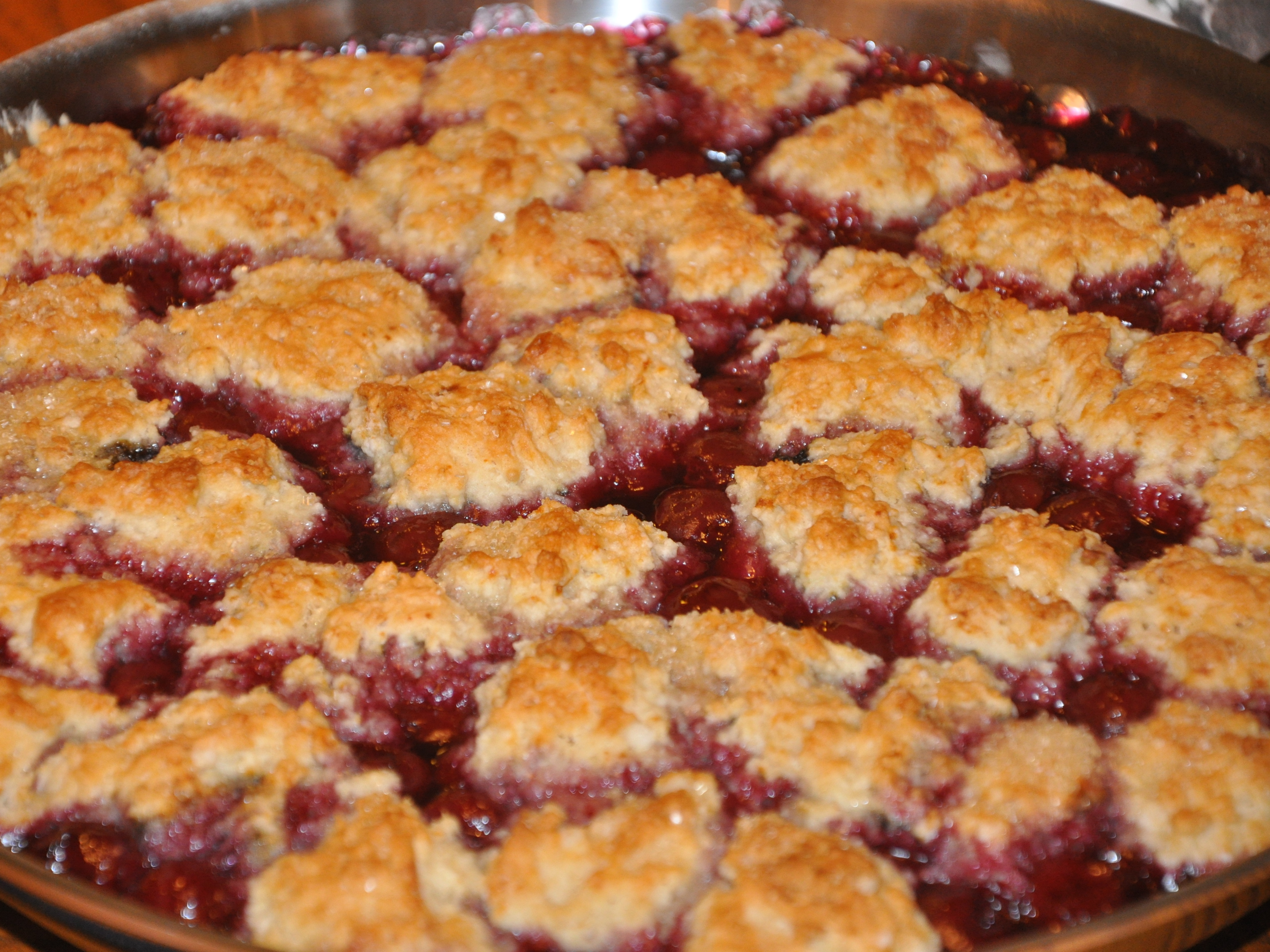 3. Using a spoon, scoop and drop 1-inch pieces of the dough, spaced about 1/2 inch apart, over the cherry filling in the skillet, then sprinkle with the turbinado sugar. Transfer the skillet to the oven and bake the cobbler until the biscuits are golden brown and the filling is thick and glossy, 25 to 30 minutes.