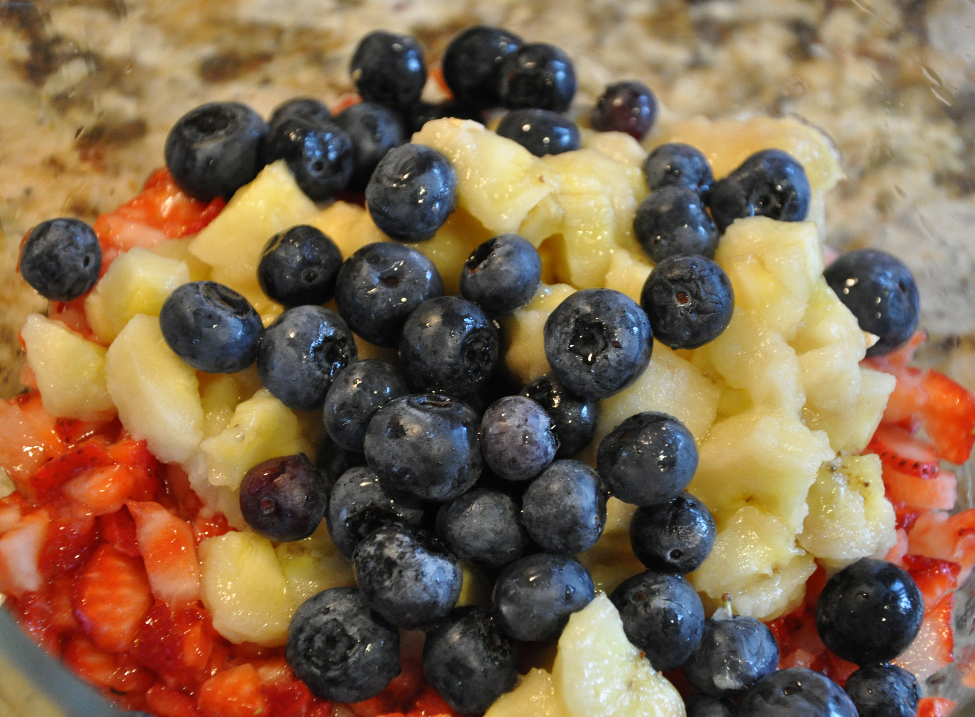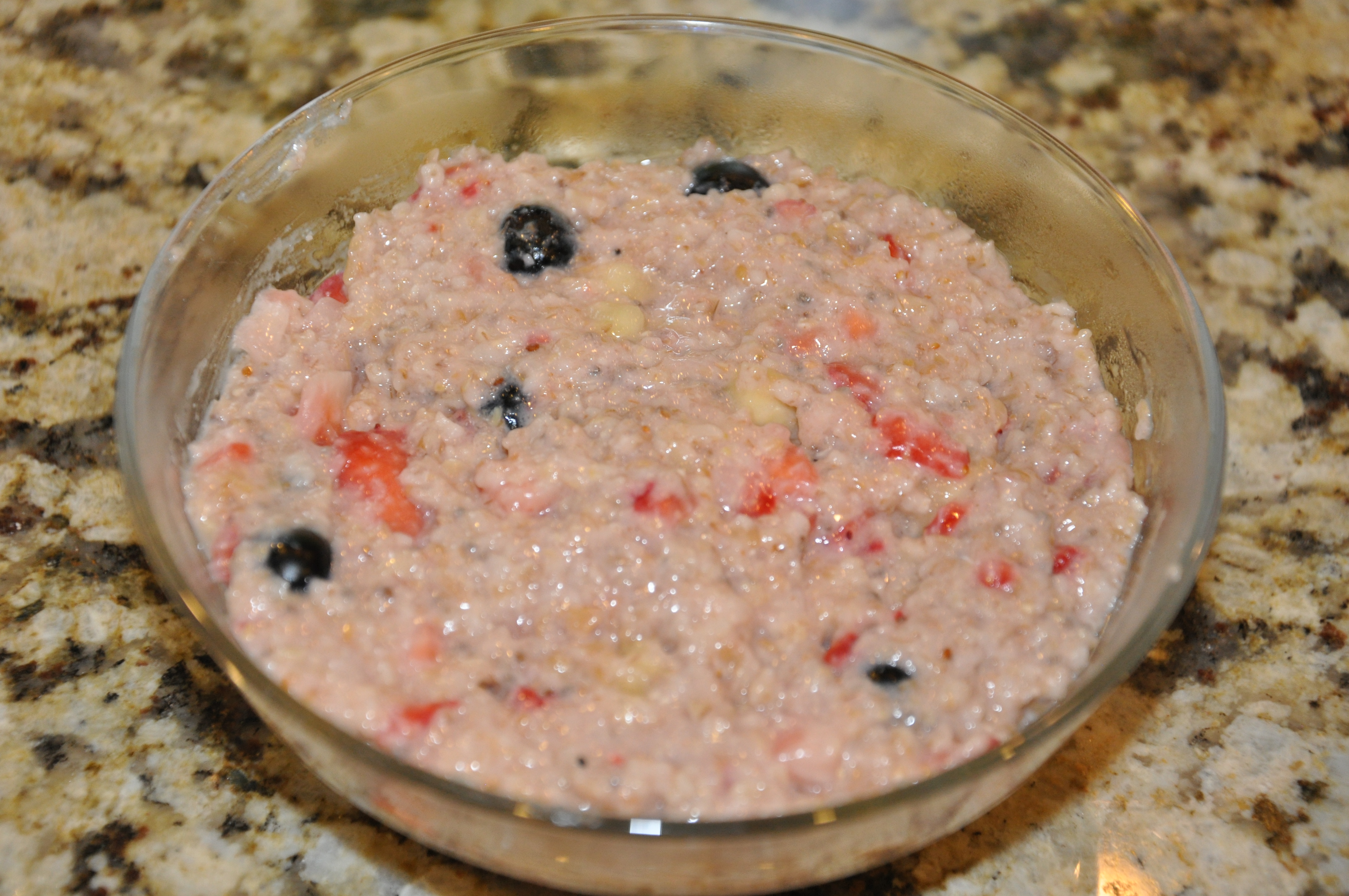 While the oats are cooking I prepare the fruit: I wash and chop 1/2 carton of organic strawberries, I chop 1 to 2 bananas, and I wash 1/2 carton of blueberries.