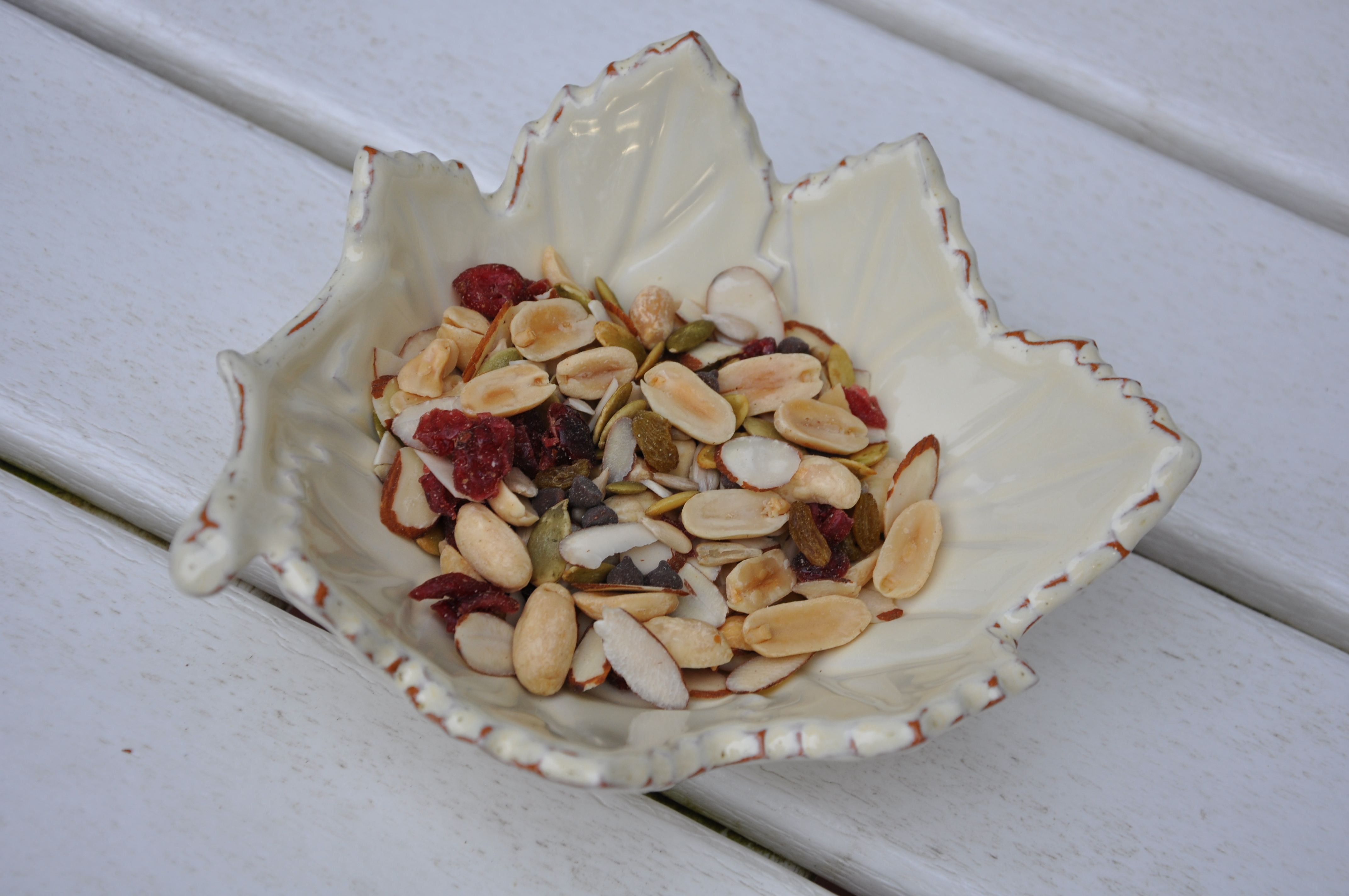 This is a quick and easy snack that helps prevent me from eating processed junk. I added a bag of Parker’s Peanuts (Virginia gourmet), a few tablespoons of Enjoy Life semi-sweet mini chocolate chips (soy and dairy free), dried cranberries or cherries, pumpkin seeds (I like “Go Pumpkins!” dry roasted organic lightly salted pumpkin seeds), golden-honey raisins, slivered almonds, and sunflower seeds. Make sure not more than one of your ingredients have added salt or it will be a sodium-loaded snack. Other than my pumpkin seeds I like to make sure none of the other ingredients are processed or prepared in any way and that they do not have any added ingredients. This snack takes under 5 minutes to prepare.
